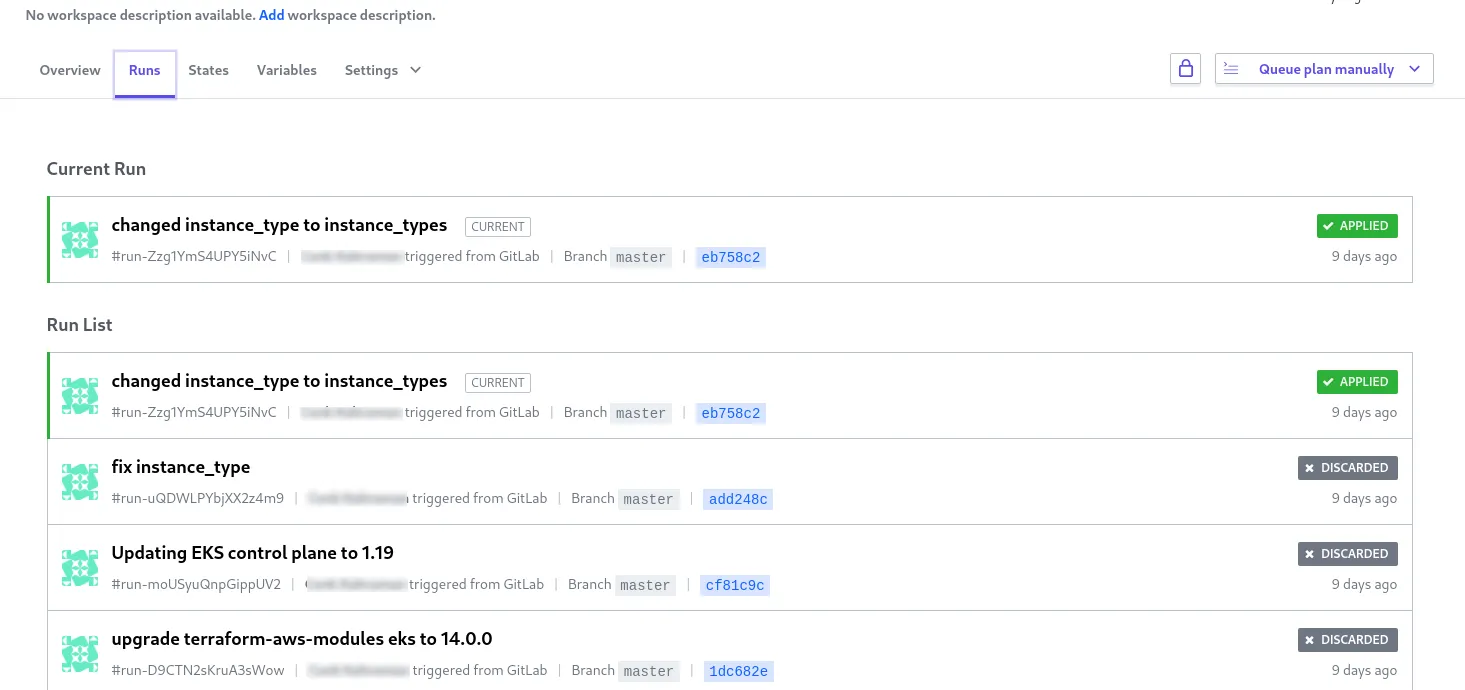 Here I’m talking about the second scenario, where terraform apply is only possible from the cloud UI only. Please also keep in mind that, when using terraform cloud, the terraform plan and other commands will use variable values from the associated Terraform Cloud workspace. So it’s TF-Cloud where you should configure access to your AWS account with the secret key of your terraform IAM user or role.