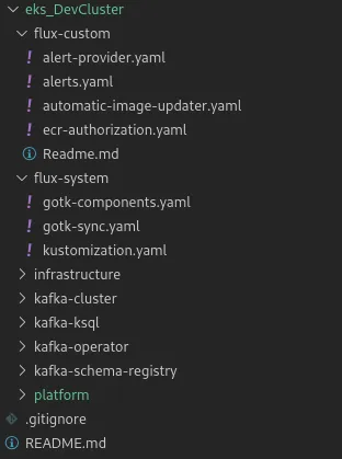 The cluster resources are going into the eks_DevCluster folder in the current example. Flux itself was installed into eks_DevCluster/flux-system and has created a namespace flux-system in the cluster where Flux run-time components are deployed then.